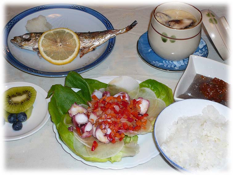 鯵の塩焼き、茶碗蒸し、タコのカルパッチョ、こんにゃくの味噌田楽